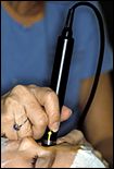 placed on the eye. Because tumors generate different "echoes" than normal tissue, sound waves above the range of